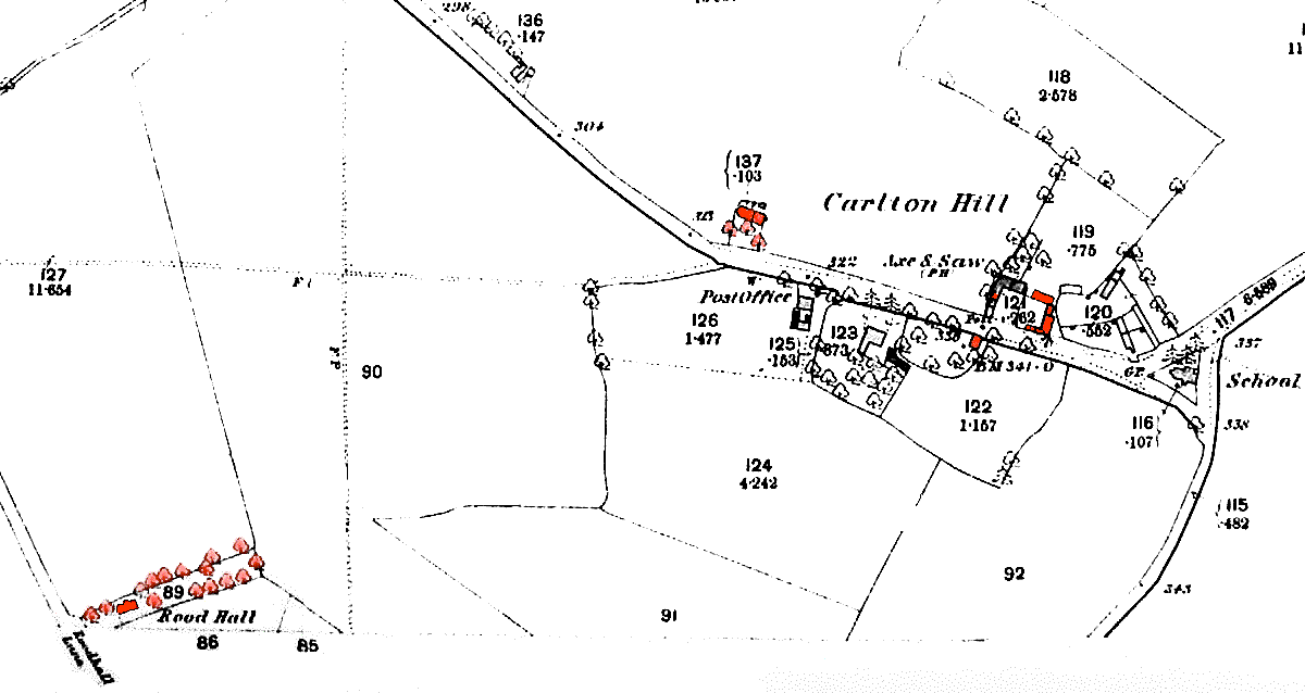 Over the centuries in Carlton many buildings have simply disappeared without trace. It seems incredible these days that a house could be demolished (or allowed to fall down) without another (or two..) being built in its place. This section hopes to remind us where some of these were. Rood HallWhen it is suggested that Rood Hall has been demolished most locals will point out that it is still standing quite happily in Carlton Green on the Thurlow road. However, once upon a time there was another Rood Hall. This one stood halfway down the green lane between the Rectory and the river Stour (as shown in red on the map below). Hence this green lane was at the time known as Rood Hall lane. Thus when the census of 1851 mentions Rood Hall (on Rood Hall lane) it is clear from the context that it is referring to this Rood Hall. In 1861 it is again mentioned in the census, however it has different occupants and the context could imply either location. It would be interesting to know when and why the Rood Hall in Carlton Green was so called! It would be nice to think that the wild apple trees growing in the green lane today are descendants from some tame varieties from the garden of Rood Hall (although they're very small fruit!). Cottages on Brinkley RoadThere once stood a pair of cottages on Brinkley road, on the corner between Hillcroft (the old Axe & Saw) and Kingsfield. They are shown roughly in the center of the map above. There is no sign of these (apart from possibly the fact that the ditch goes through a pipe here), the land is just a uniform part of the larger field now. Axe & Saw BarnsThe barns shown on the map next to the Axe & Saw (now Hillcroft) had mostly disappeared by 1971, with the remaining stable being demolished to make way for the construction of The Gables. Also at some point a part of the main house itself was removed from the gable end closest to the road, as was a lean to building from the right. Norney FarmNorney farm was a neighbour of Lophams hall. Now nothing remains but a ploughed field apart from the farmyard pond which is now surrounded by trees and shrubs. Hillview CottageThe 18th century Hillview cottage (opposite the Axe & Saw on the above map) was demolished in 2003 after the previous owner Mrs McGregor passed away. Two new houses were built on its land. Hillview has its own page here. Carlton Grange How something as large as Carlton Grange farm can disappear without a huge effort is amazing - there is nothing left apart from woodland now of this large country estate with